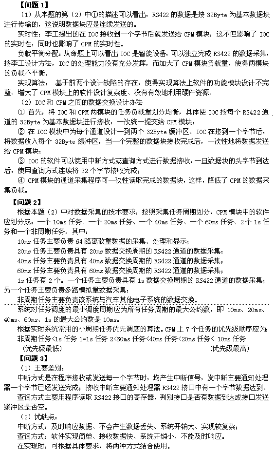 会上,王工提出了强烈的反对意见,认为这种设计方法绝对不可取,这种方法只考虑了软件的简单与便利,而没有针对软件特点考虑问题,在设计中对实时性、负载平衡分配以及实现算法上均存在缺陷,必须改进。