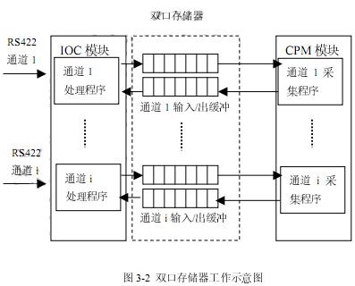 李工在设计IOC模块软件时指出:为了使CPM模块能够及时处理RS422数据,在IOC 与 CPM 间的双端口存储器中为每个 422 通道设计一级缓冲,当某通道接收一个字节时,就将数据放入缓冲,由 CPM 接收(其结构见图 3-2)。这样的好处在于每当有数据输入时,CPM模块可立即读取,而增大双口缓冲的目的是在CPM来不及处理时可防止数据的丢失。同时,IOC 中的程序相对简单、实时性好、可以不考虑422通道的数据传输周期,只要按查询方式对16路422输入进行查询读取即可。