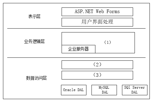 1)执行业务逻辑/业务组件/业务构件 2)数据访问接口层/DAL接口 3)工厂层/DAL工厂/数据访问工厂