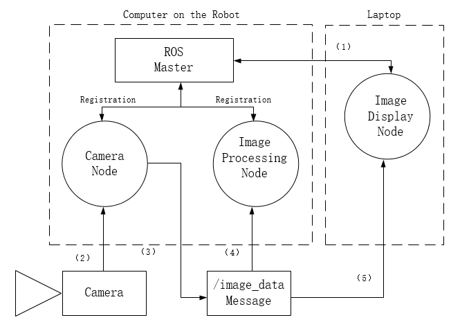 “|机器人开始阶段,所有节点都要注册 (Registration) 到 Master上,注册后,摄像 头节点声明它要发布(Publish)一个叫作/image_data的消息。另外两个节点(图像处理处理节点和图像显示节点)声明它们需要订阅( Subscribe) 这个/image_data消息。因此, 一旦摄像头节点收到相机发送的数据(Data),就立即将数据/image_data直接发送到另外两个节点。
