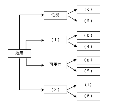 在架构评估过程中,质量属性效用树 (utility tree) 是对系统质量属性进行识别和优先级排序的重要工具。请给出合适的质量属性,填入图 1-1 中 (1)、(2) 空白处;并选择题干描述的 (a)~(o) ,填入(3) ~(6) 空白处,完成该系统的效用树。