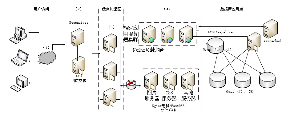 综合王工和李工的提议,项目组完成了新商品交易平台的系统架构设计方案。新系统架构图如图 5-1 所示。请从选项 (a) - (j) 中为架构图中(1) - (8) 处空白选择相应的内容,补充支持高并发的 Web 应用系统架构设计图。