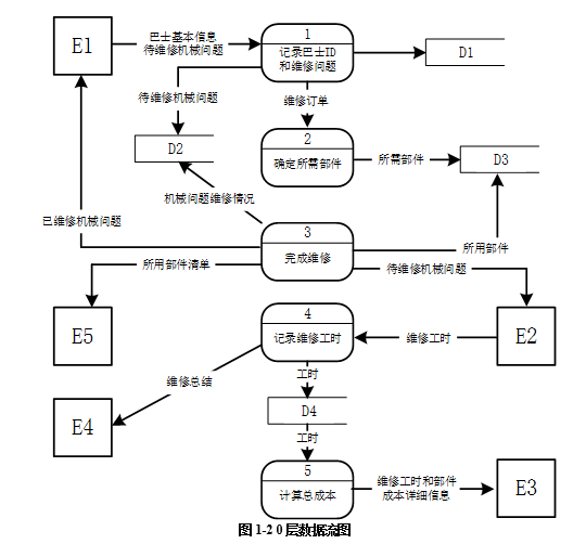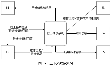 现采用结构化方法对巴士维修系统进行分析与设计,获得如图1-1所示的上下文 数据流图和图1-2所示的0层数据流图。