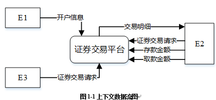 现采用结构化方法对该证券交易平台进行分析与设计,获得如图1-1所示的上下文数据流图和图1-2所示的0层数据流图。